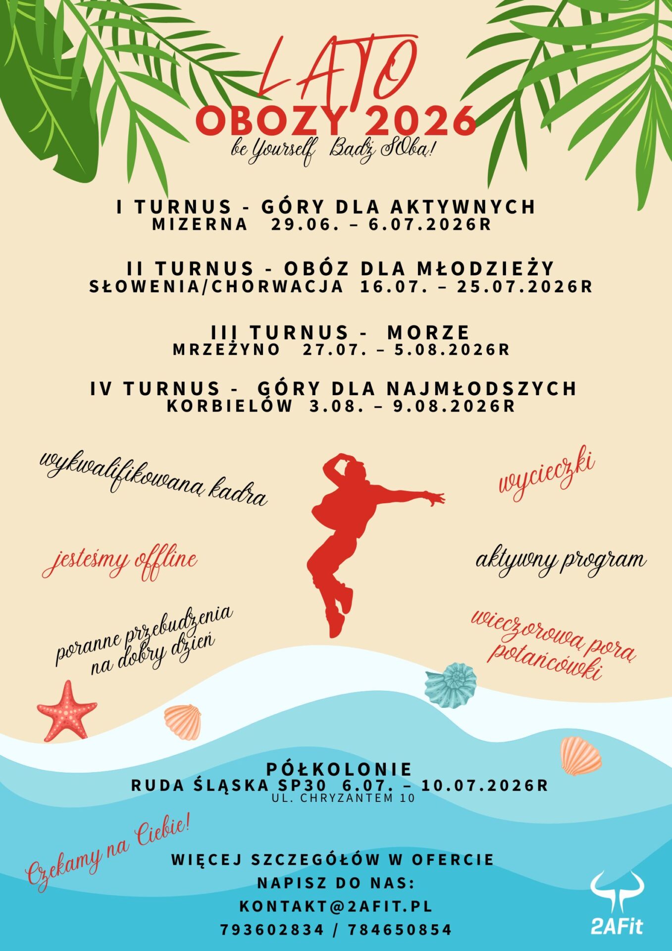 Zapraszamy Państwa do zapoznania się z naszą ofertą obozów taneczno- sportowych dla dzieci i młodzieży w sezonie LATO 2026 z 2AFit. Jak co roku stawiamy na aktywne i zdrowe spędzanie czasu letniego w otoczeniu piękna natury, która w ostatnich czasach przynosi ukojenie, sprawia, że chcemy z nią jeszcze bardziej obcować. Przedstawiamy poniżej nasze hasła obozowe, które w czasie wypoczynku, ale również w codzienności i na każdym etapie życia mają wspierać rozwój Waszych dzieci: